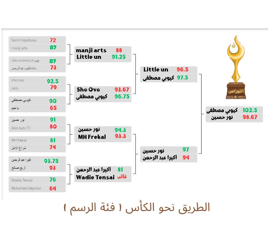 فبعد اسبوعين من اطلاق موضوع البطولة النهائي (الأقصى)، على مرحلتين؛ تم يوم الجمعة 14 جمادي الثانية 1447هـ - 5/ 12/ 2025م إعلان النتائج بحمد الله على صفحة نبراس المانجاكا الرسمية، حيث وصلنا بفضل الله للمشهد الأخير، والذي أعلنا فيه أسماء الأبطال ونتائج نهائي بطولتنا الأولى كالتالي: