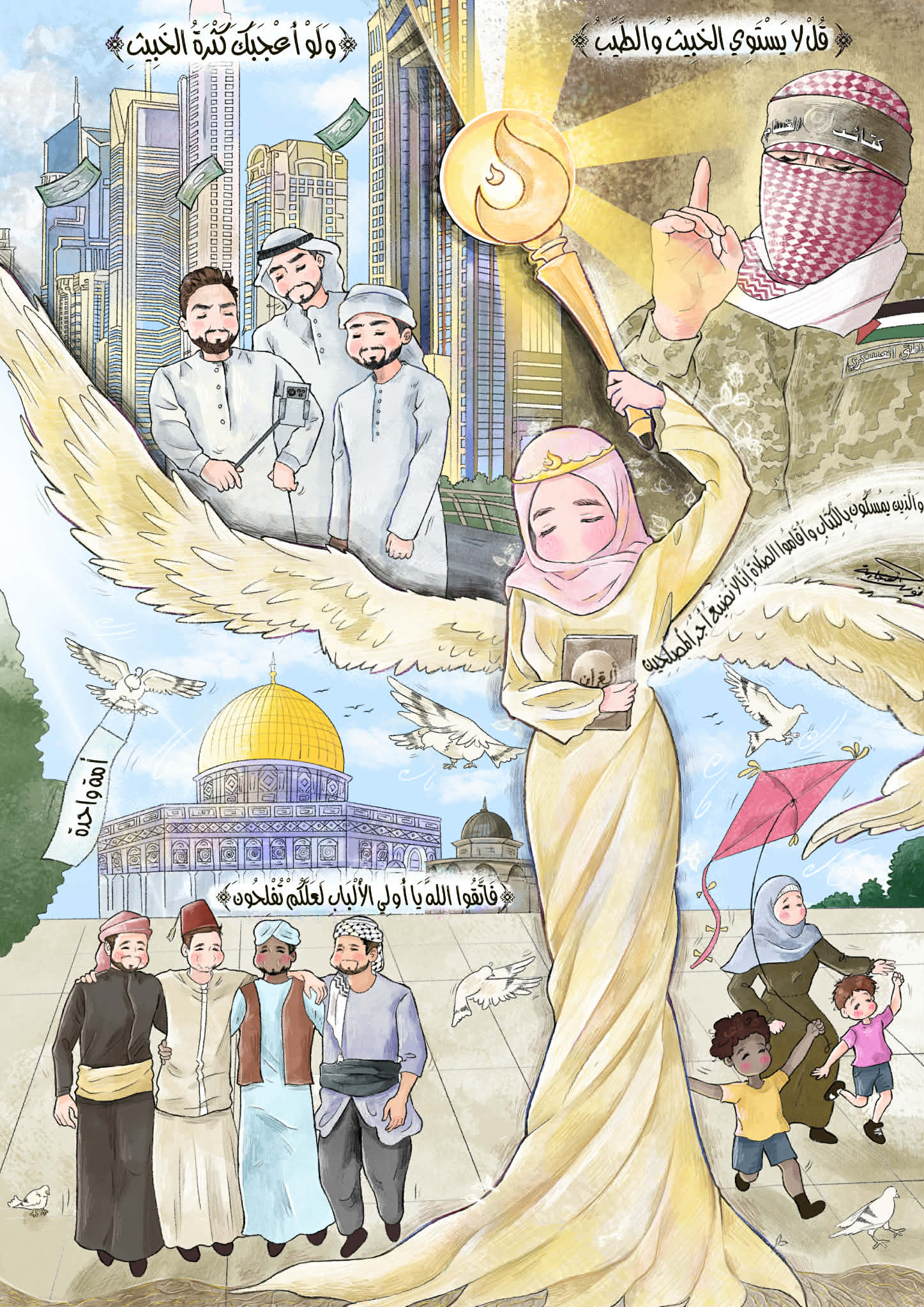 رسمة جميلة مريحة للعين متقنة وتلوينها جميل، لكن نوعا ما يبدو وكان الفكرة التي في رأس الرسامة لم تصل بشكل واضح حيث يمكن تأويلها بشكل خاطئ، ليس ظلما لها بل لان الرسمة توحي بذلك، من خلال تخصيص ازياء محددة لتمثل الخبيث وهذا تعميم خاطئ ولا يعكس الحقيقة، حيث أن ذلك الزي يمثّل أيضا فئة كبيرة من أهل الصلاح والتقوى في الأمة وممن بذلوا الغالي والنفيس لأجلها، مما يجعل في ذلك التعميم ظلم لهم، حتى وإن لم تقصد الرسامة ذلك، طبعا هذا لم يؤثر كثيرا على جمال الرسمة وايصالها للفكرة بالمجمل ولكن أحببنا التوضيح على تلك النقطة للأهمية، ومن هذا المنطلق وحتى لا تخسر اللوحة قيمتها العظيمة، ننصح الرسامة بالتالي: