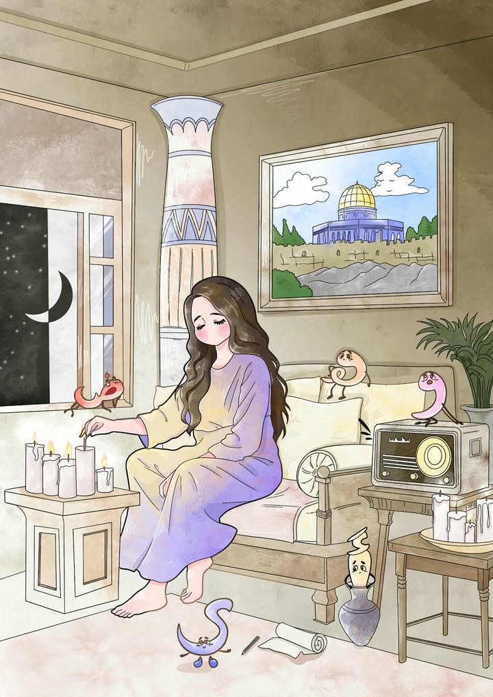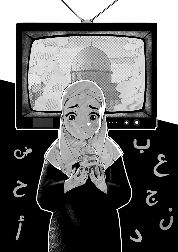 الرسمة اجمالا تميزت باستعمال أساليب رمزية في الصورة كصورة القدس وإشعال الشموع كتعبير عن المعاناة بشكل هادئ من شيء يشغل البال، والحروف المبعثرة أيضا تدل على ان الافكار مشتتة ومشوشة مع إضافة ملامح الحزن و العجز الواضح عليها، فإعطاء حياة للحروف يقدم معنى الرمزية نفسها التي قدمتها لهم الكاتبة في القصة حيت جعلت منهم شخصيات حية لها راي خاص و تعبر عن ذاتها، أي انها جسدت أسلوب الكاتبة في رسمتها بإتقان و الصورة تعتبر الأكثر تناسبا و تناسقا كغلاف للقصة لأنها تجسد انعكاس مباشر لها وللأسلوب المعتمد فيها، ورغم ذلك فهناك من ذكر أن رسمة كيوبي لغلاف قصة رقية هي من تجعل الاخرين اكثر قربا من روح الفكرة العامة للقصة، لكونها تعكس ملامح فتاة متأثرة تبكي وهي تحمل مجسم الاقصى بين يديها مما يعطي تأثيرا أعمق بالقضية، على خلاف رسمة نور التي جعلت الاقصى كلوحة معلقة على الجدار، وقد لا تعطي انطباع مباشر عن كونه جوهر الفكرة..